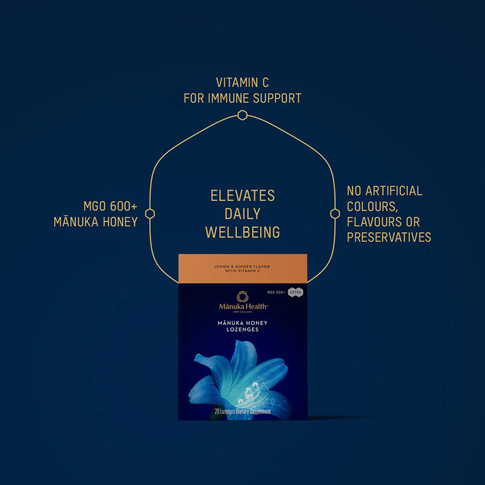 Lemon, ginger, and mānuka meet within this sweet and soothing lozenge. With the powerful natural protection of MGO600+ mānuka honey and vitamin C to inspire wellness from within